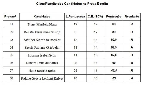 Foram divulgados os resultados da escrita para do em São José do Sul. Conforme , todas as questões terão 2,5 pontos e somente serão classificados os candidatos que obtiverem, no mínimo, 50% da pontuação aferida à .